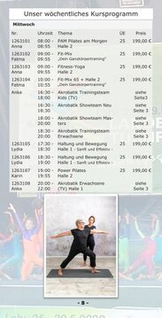 Wenn Sie die jeweilige Seite vergrößert sehen wollen, fahren Sie mit dem Cursor über die Seite, suchen den gewünschten Kurs und buchen ihn unter der Kursauswahl des Tages.